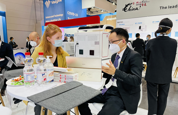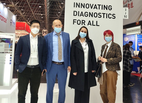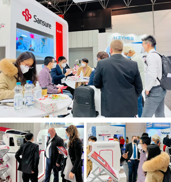在今年会jinnianhui展台,“全自动解决方案”“半自动解决方案”“新冠整体解决方案”,以最大程度满足不同国家和地区客户、不同应用场景检测需求的特点,获得了众多来访国际客户的好评。尤其是iPonatic四通道产品,以其便捷、易操作、检测时间快、检测项目多等优势吸引了会场一大波新老“粉丝”的目光。
